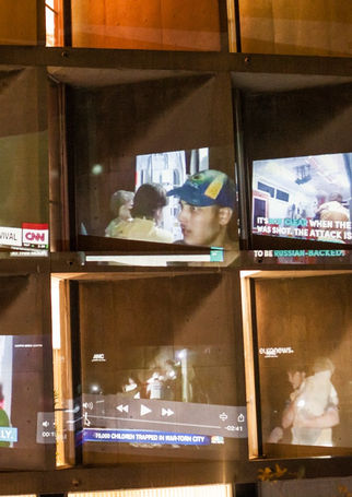 I projected news coverage of Omran's surfacing clip on the façade of the Carpenter Center at Harvard University, juxtaposed with the sounds of Vivaldi’s Four Seasons. Over the repeating squares of Le Corbusier’s design, the news’ ceaseless repetition of Omran's footage with cinematic effects and harrowing images was magnified, putting into relief the exploitation of human suffering for the sake of TV ratings.